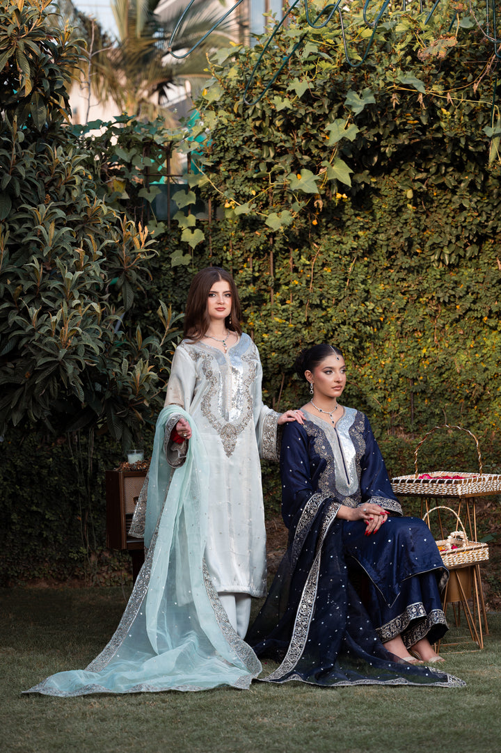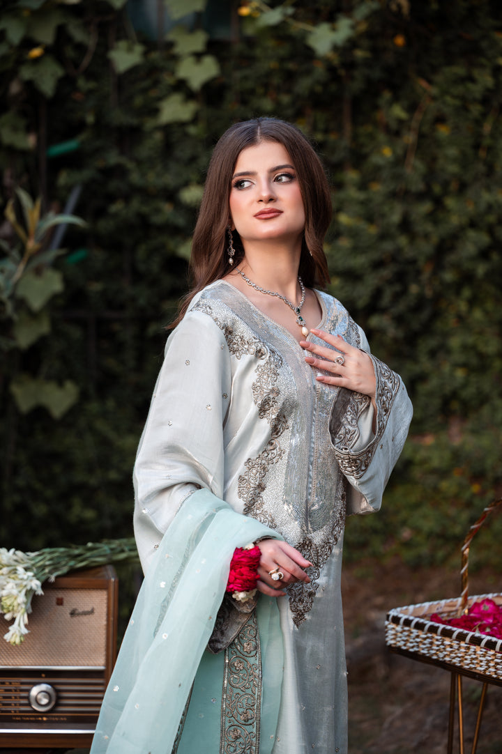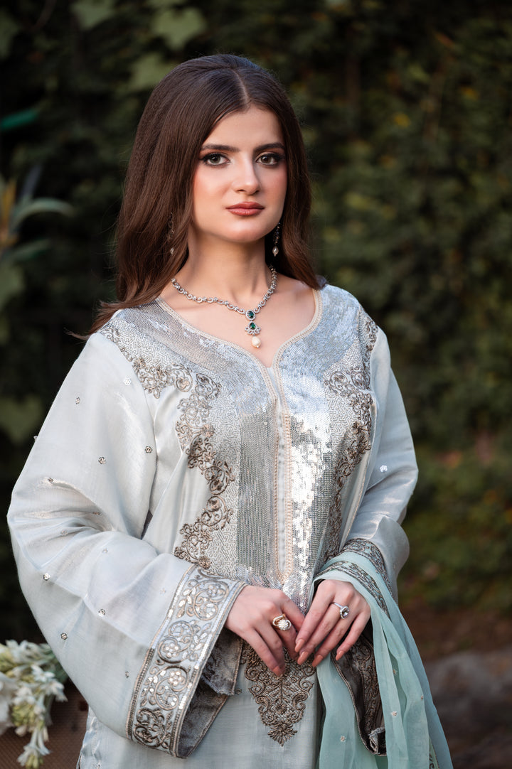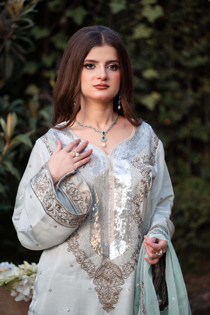 A serene pistachio ensemble crafted from premium lama silk, adorned with intricate tilla and sequin embroidery along the neckline and borders. The outfit exudes subtle glamour with its delicate sheen and refined detailing. Paired with a soft organza dupatta featuring hand-embellished borders, it’s a timeless choice for festive and evening wear.