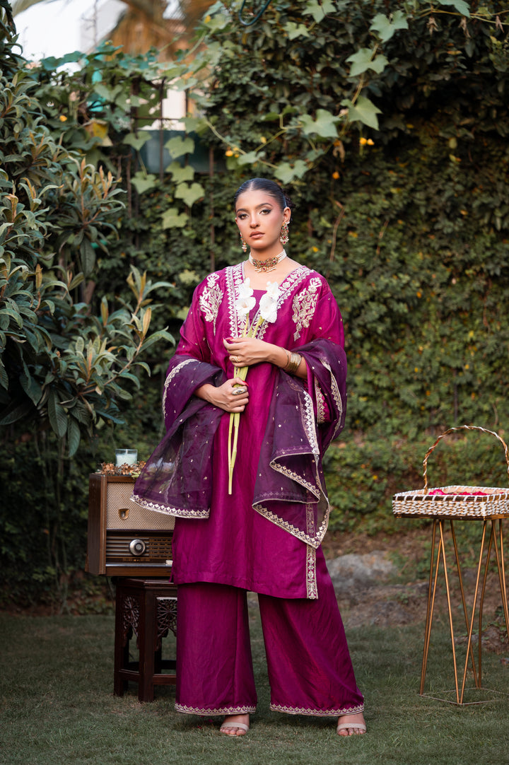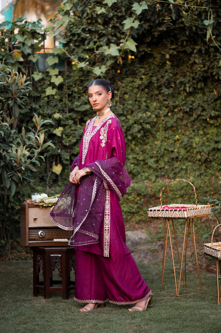 A rich magenta ensemble crafted from premium lama silk, adorned with intricate tilla and sequin embroidery along the neckline and sleeves. The design features a graceful blend of tradition and elegance, accentuated by a sheer organza dupatta with delicate embellishments and borders. Perfect for festive evenings and celebratory gatherings.