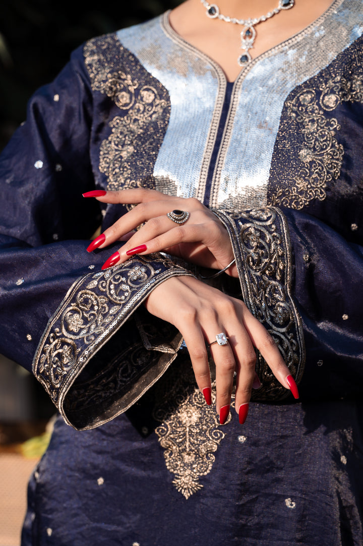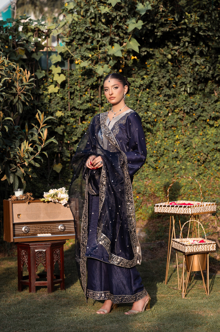 Drape yourself in timeless elegance with this exquisite navy blue lama silk ensemble, crafted from fabric with a natural lustrous sheen. The outfit features intricate tilla and sequin embroidery, adding just the right touch of festive sparkle. Paired with a delicate organza dupatta adorned with subtle embellishments and embroidered borders, this design beautifully blends traditional charm with modern finesse.